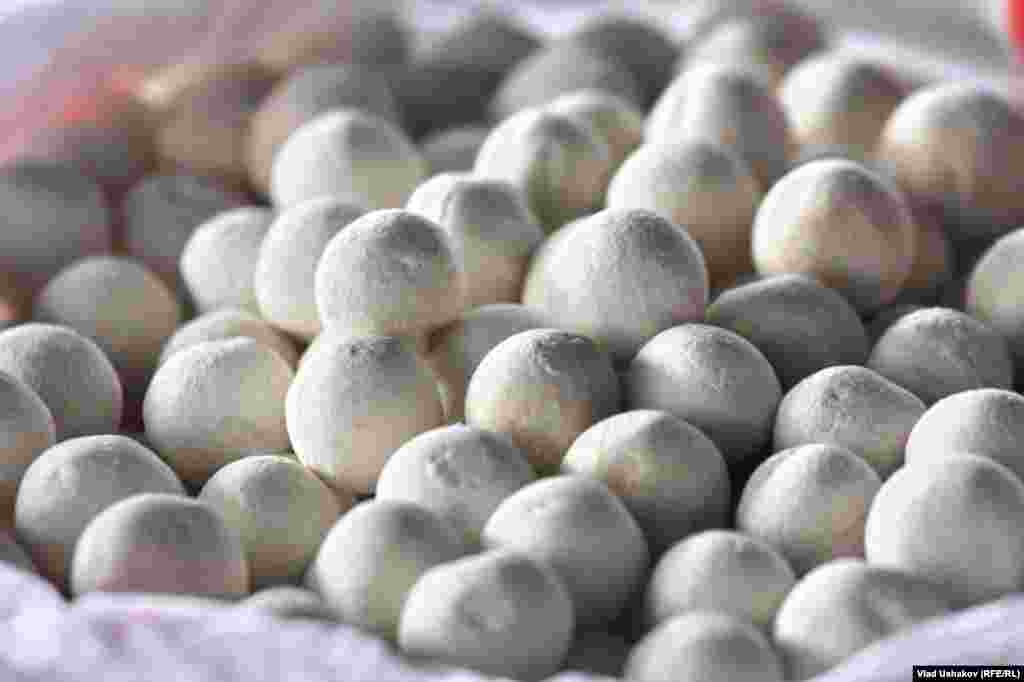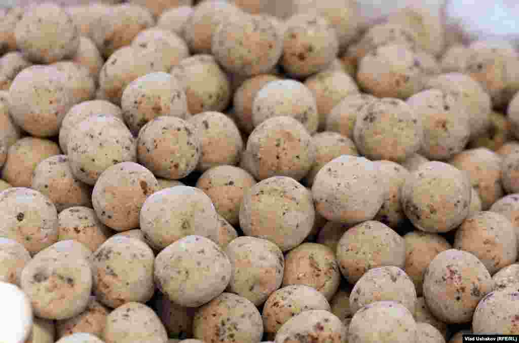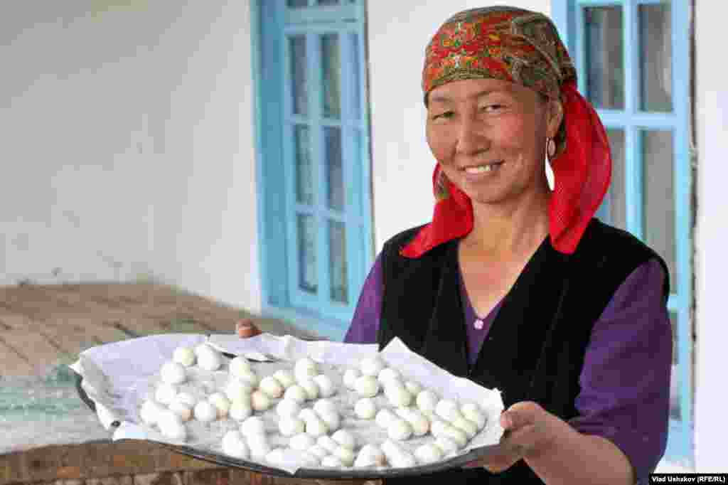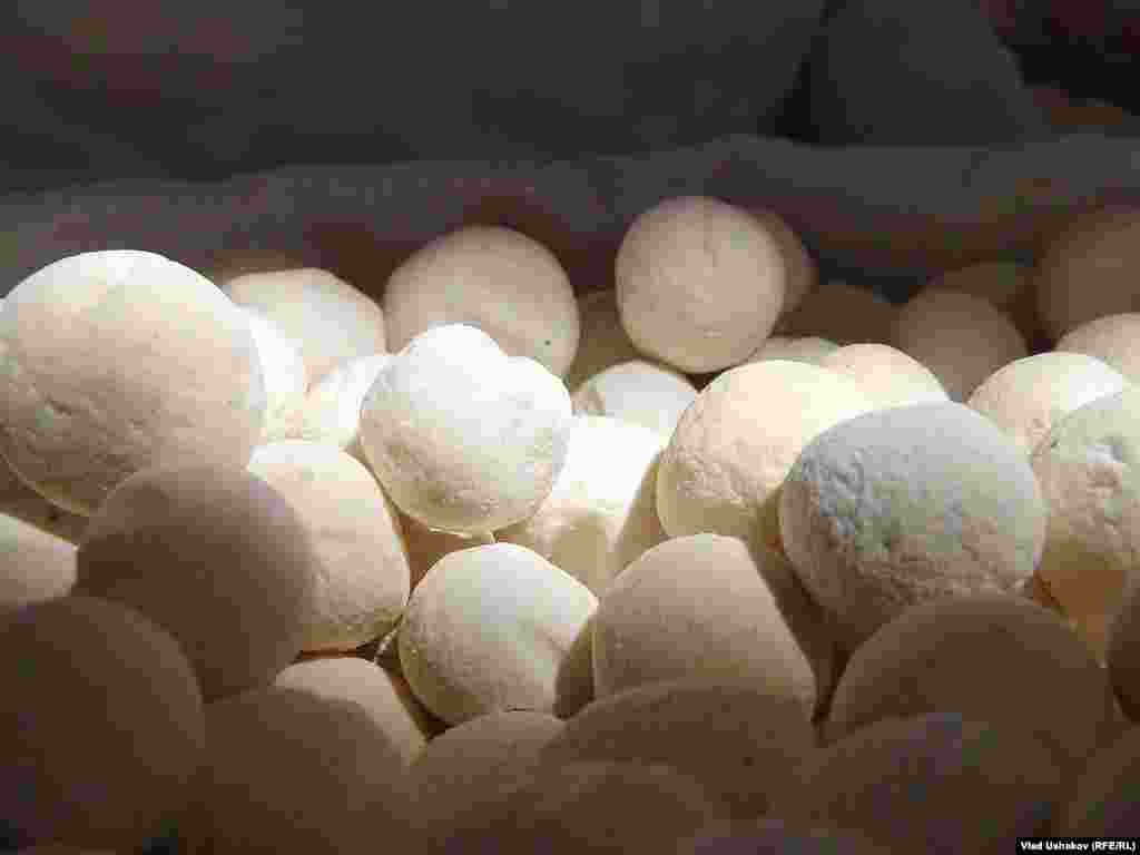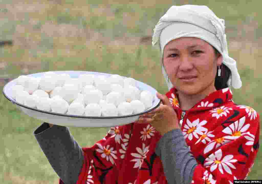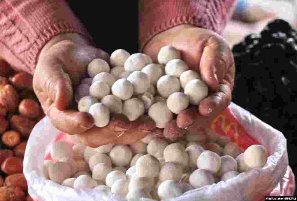 Пожалуй один из самых распространенных продуктов питания на просторах Азии. Это засушенные соленые шарики, приготовленные из густой закваски кислого молока. Чаще всего это коровье молоко, но в зависимости от региона может меняться состав продукта. Правильно приготовленный курут может храниться более 7-8 лет. Зимой его размачивают в кипятке и подают в подогретом виде с топленным маслом. Фотогалерея Влада Ушакова, Кыргызская служба РСЕ\РС