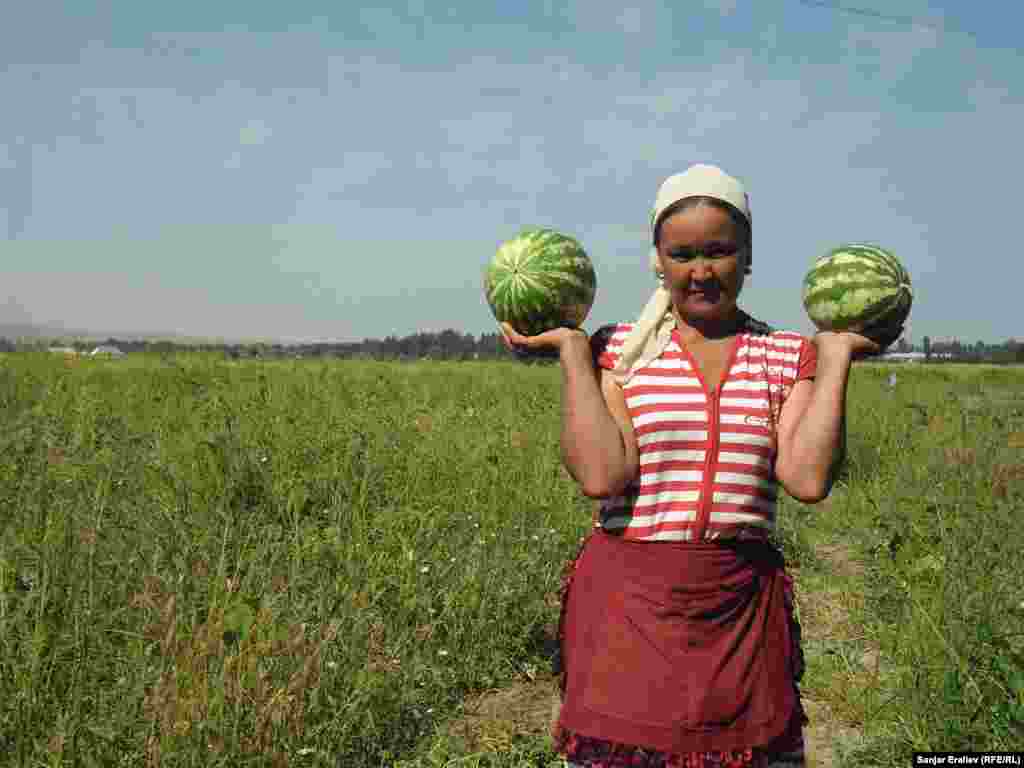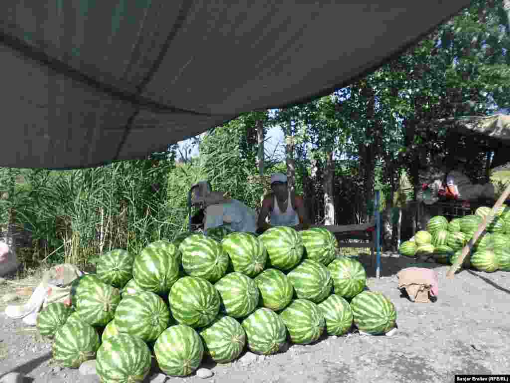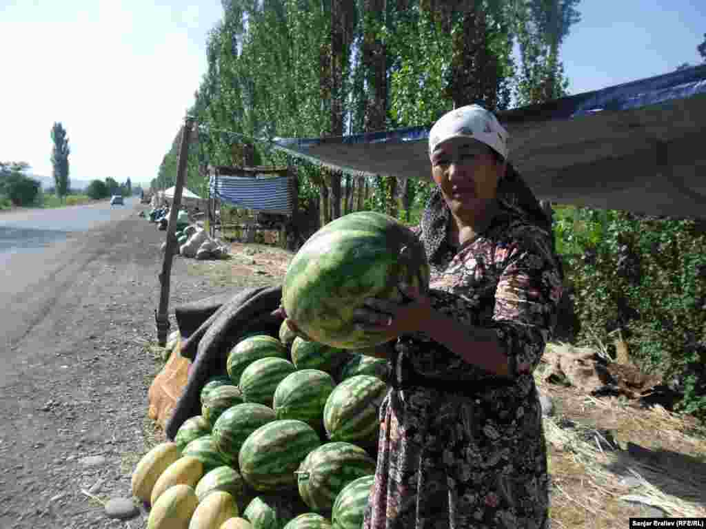 Вдоль автотрассы Бишкек-Ош у самого села Акман (Базар-Курганский район) растянулись ряды импровизированного арбузного базара. Местные крестьяне продают их от 5 до 100 сомов за одну штуку в зависимости от размера. Фоторепортаж Санжара Эралиева, корреспондента Кыргызской службы РСЕ\РС "Азаттык".